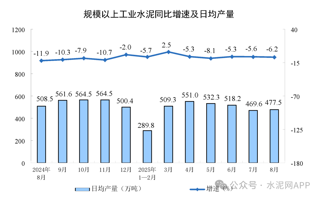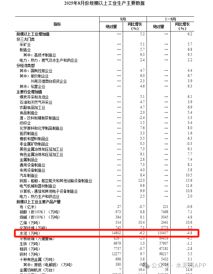據(jù)國家統(tǒng)計局數(shù)據(jù),8月份,規(guī)模以上工業(yè)增加值同比實際增長5.2%(增加值增速均為扣除價格因素的實際增長率)。從環(huán)比看,8月份,規(guī)模以上工業(yè)增加值比上月增長0.37%。1—8月份,規(guī)模以上工業(yè)增加值同比增長6.2%。其中水泥行業(yè)8月份全國水泥產(chǎn)量14802萬噸,同比下降6.2%;1-8月全國水泥產(chǎn)量110457萬噸,同比下降4.8%。此外,數(shù)據(jù)顯示,2024年1-8月全國水泥產(chǎn)量為115907萬噸,由此計算,今年1-8月水泥全口徑產(chǎn)量比去年同期減少5450萬噸,降幅4.7%。