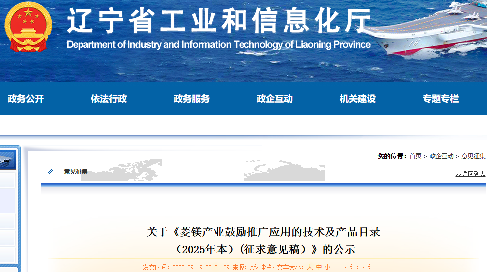 按照《遼寧省人民政府辦公廳關(guān)于推進(jìn)菱鎂行業(yè)高質(zhì)量發(fā)展的實(shí)施意見》(遼政辦發(fā)〔2023〕15號(hào))精神,為持續(xù)搭建技術(shù)交流平臺(tái),推動(dòng)新技術(shù)、新產(chǎn)品成果轉(zhuǎn)化,持續(xù)提升菱鎂行業(yè)高端化、智能化、綠色化水平。經(jīng)企事業(yè)單位自主申報(bào)、市工信局推薦,我廳征集了已進(jìn)入或接近產(chǎn)業(yè)化應(yīng)用階段、有推廣應(yīng)用意向、暫無社會(huì)異議的22項(xiàng)新技術(shù)、新產(chǎn)品,經(jīng)相關(guān)專家論證,現(xiàn)將《菱鎂產(chǎn)業(yè)鼓勵(lì)推廣應(yīng)用的技術(shù)及產(chǎn)品目錄(2025年本)(征求意見稿)》予以公示,公示期為5個(gè)工作日。