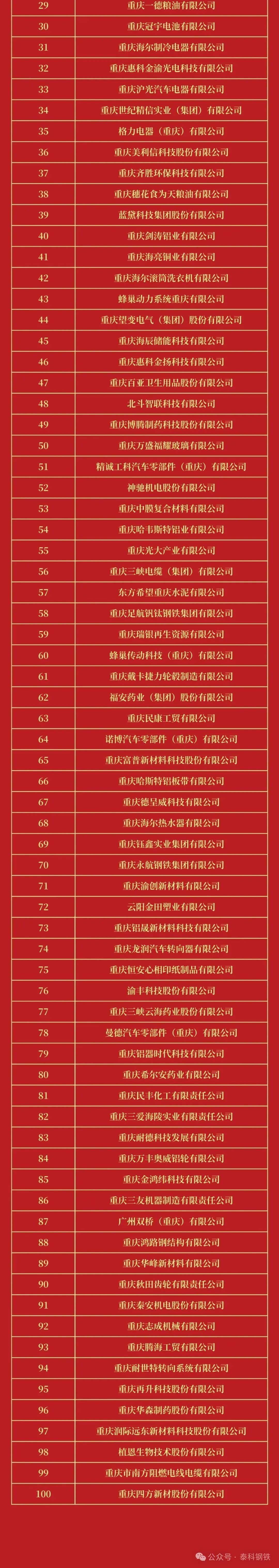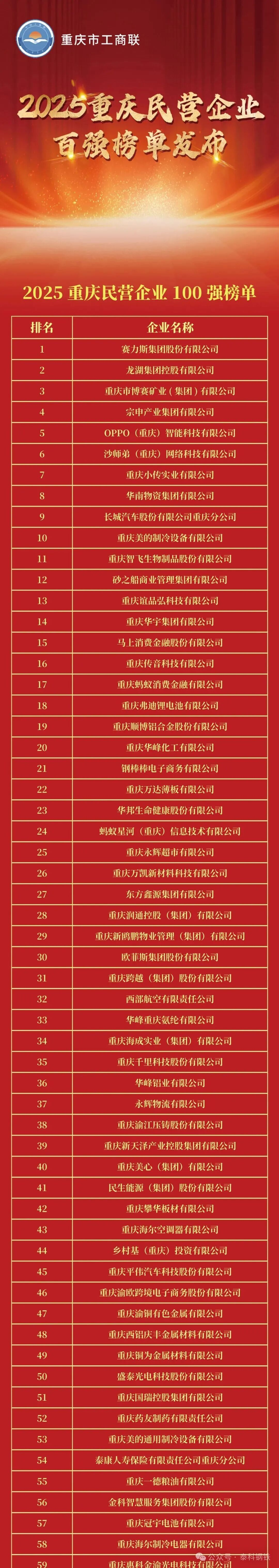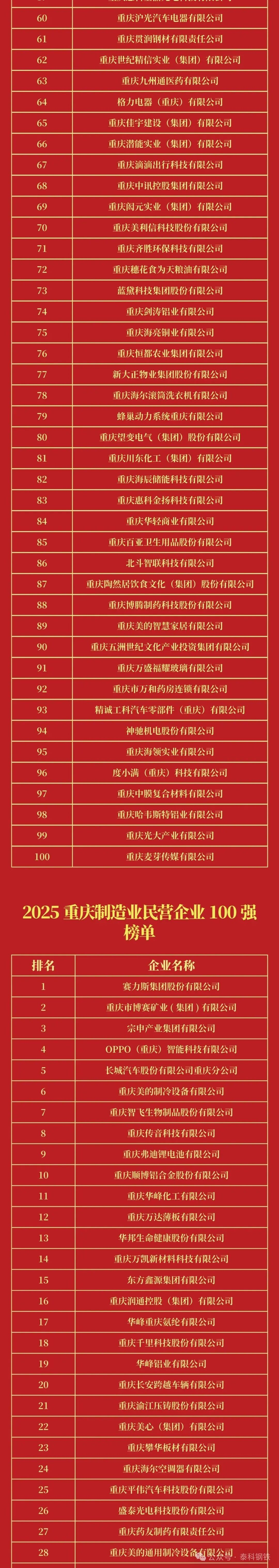 9月19日,重慶市工商聯(lián)、市發(fā)改委、市經(jīng)信委舉辦“2025重慶民營企業(yè)100強(qiáng)發(fā)布會(huì)”會(huì)上,2025重慶民營企業(yè)100強(qiáng)和2025重慶制造業(yè)民營企業(yè)100強(qiáng)榜單正式發(fā)布。鋼鐵、冶金行業(yè),賽博礦業(yè)、萬達(dá)薄板、攀華板材等上榜民營企業(yè)100強(qiáng),足航釩鈦鋼鐵、永航鋼鐵集團(tuán)等上榜制造業(yè)民營企業(yè)100。