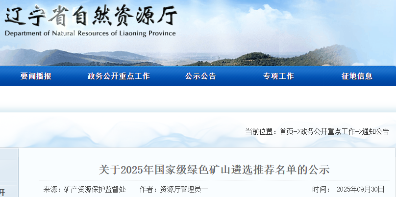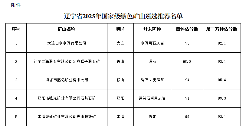 按照《關于進一步加強綠色礦山建設的通知》(自然資規(guī)〔2024〕1號)和《自然資源部辦公廳關于開展新一批國家級綠色礦山遴選工作的通知》(自然資辦發(fā)〔2025〕8號)相關要求,遼寧省自然資源廳嚴格組織開展國家級綠色礦山遴選推薦工作。經(jīng)企業(yè)自主申報、省廳綜合評審,現(xiàn)擇優(yōu)確定5家企業(yè)作為2025年國家級綠色礦山遴選推薦對象,具體名單詳見附件。