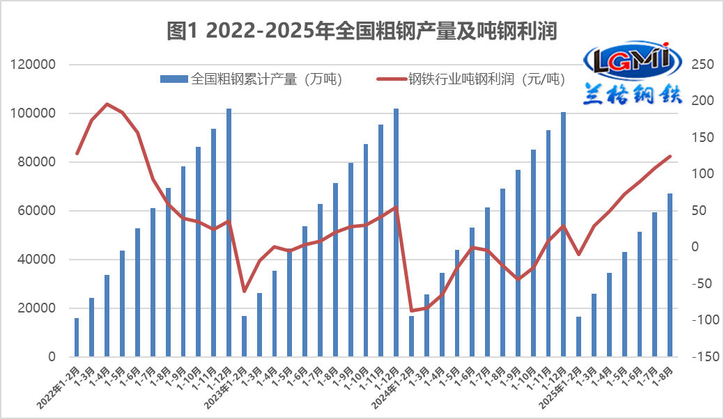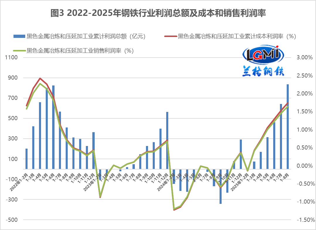 8月份,在經(jīng)濟(jì)運行穩(wěn)中有進(jìn)、限產(chǎn)政策逐步落實、淡季效應(yīng)持續(xù)突顯、成本支撐維持韌性的影響下,國內(nèi)鋼鐵市場呈現(xiàn)了震蕩走弱的行情,但由于原料成本持續(xù)下降,使得鋼鐵行業(yè)的盈利空間持續(xù)擴(kuò)大。根據(jù)國家統(tǒng)計局發(fā)布數(shù)據(jù)顯示,2025年1-7月黑色金屬冶煉和壓延加工業(yè)盈利643.6億元,同比增長5175.4%。從月度數(shù)據(jù)來看,1-2月鋼鐵行業(yè)虧損15.5億元,3月份鋼鐵行業(yè)盈利90.6億元,4月份鋼鐵行業(yè)盈利94.1億元,5月份鋼鐵行業(yè)盈利147.7億元,6月份鋼鐵行業(yè)盈利145.9億元,7月份鋼鐵行業(yè)盈利180.8億元,8月份鋼鐵行業(yè)盈利193.4億元,環(huán)比增加12.6億元。