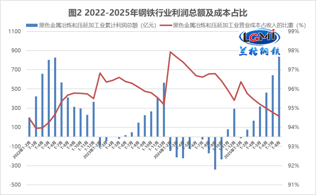 從全國粗鋼產(chǎn)量及噸鋼利潤的數(shù)據(jù)來看,2025年1-8月國內(nèi)鋼鐵生產(chǎn)企業(yè)處于“控產(chǎn)擴(kuò)利”的局面,噸鋼盈利125元,較上年同期增加150元(詳見圖1)。從營業(yè)成本來看,1-8月環(huán)比持續(xù)下降,但仍處相對高位,1-8月營業(yè)成本占營業(yè)收入的比重為94.6%,較上年同期下降2.2個百分點(詳見圖2)。從鋼企利潤率來看,1-8月鋼企盈利能力持續(xù)增強(qiáng),成本利潤率為1.74%,較上年同期上升2.08個百分點;銷售利潤率為1.65%,較上年同期上升1.97個百分點(詳見圖3)。