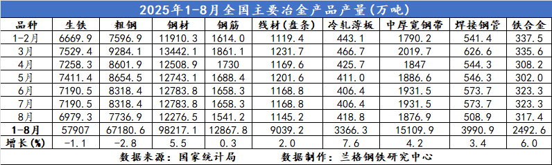 表1 2025年1-8月全國主要冶金產(chǎn)品產(chǎn)量
