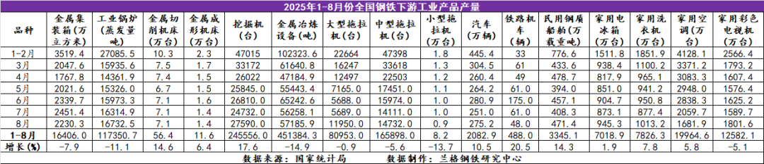 表2 2025年1-8月全國鋼鐵下游工業(yè)產(chǎn)品產(chǎn)量