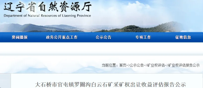 大石橋市官屯鎮(zhèn)羅圈溝白云石礦采礦權(quán)出讓收益評估報告公示
