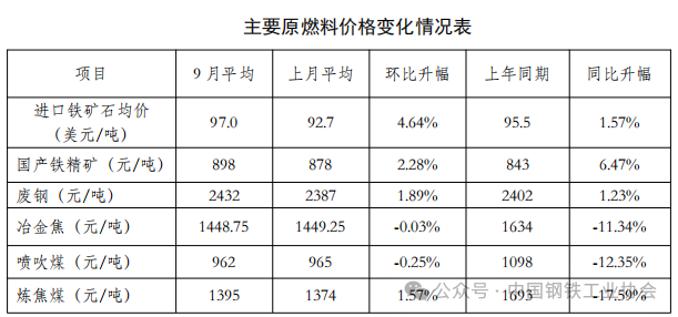 從原燃料來看,與8月相比,主要原燃料各品種平均價格以上升為主。其中,進口鐵礦石漲幅較大,為4.64%,煉焦煤漲幅較小,為1.57%,冶金焦、噴吹煤均價較為平穩(wěn)。(見下表)