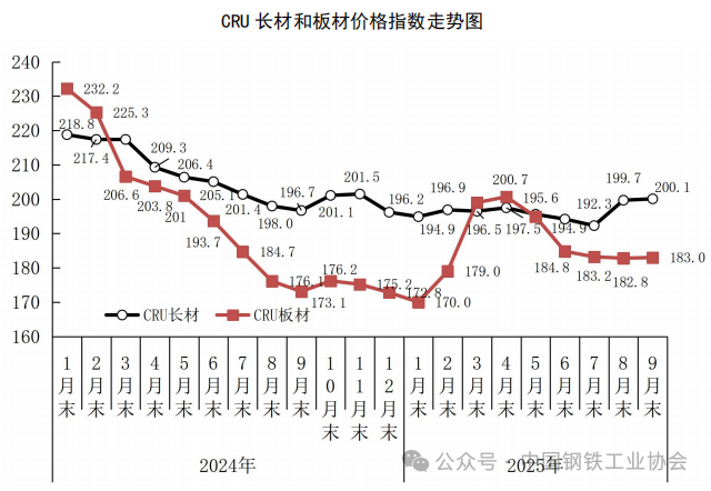 2025年1—9月,CRU國際鋼材價格指數(shù)平均值為189.7 點,同比下降12.6點,降幅為6.2 %。其中,CRU長材指數(shù)平均值為196.4點,同比下降11.4點,降幅為5.5 %;CRU板材指數(shù)平均值為186.4點,同比下降13.2點,降幅為6.6 %。