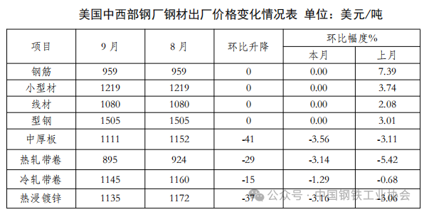 2025年9月份,CRU北美鋼材價格指數(shù)為232.7點,環(huán)比下降4.4點,降幅為1.9%;美國制造業(yè)PMI為49.1%,環(huán)比上升0.4個百分點。本月美國中西部鋼廠鋼材品種走勢分化,鋼筋、小型材、線材、型鋼價格較上月持平,其余品種價格有所下降,中厚板降幅較大,為3.56%,冷軋帶卷降幅較小,為1.29%。(見下表)