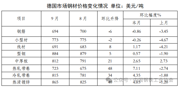 9月份,CRU歐洲鋼材價格指數(shù)為207.6點,環(huán)比上升5.8點,升幅為2.9 %;2025年9月,歐元區(qū)制造業(yè)PMI終值為49.8,較上月小幅下滑,歐元區(qū)制造業(yè)在8月份短暫擴張后,于9月份再度陷入了收縮區(qū)間,主要成員國制造業(yè)PMI均有所下降:德國、法國、意大利、西班牙制造業(yè)PMI指數(shù)分別為49.5%、48.2%、49%、51.5%,分別降0.3、2.2、1.4和2.8個百分點。本月德國市場主要鋼材品種價格走勢分化,鋼筋穩(wěn)中有降,小型材平穩(wěn)運行,線材、型鋼穩(wěn)中有升,其余品種價格均明顯上升,熱軋帶卷升幅較大,為7.11%,中厚板升幅較小,為2.65%。(見下表)