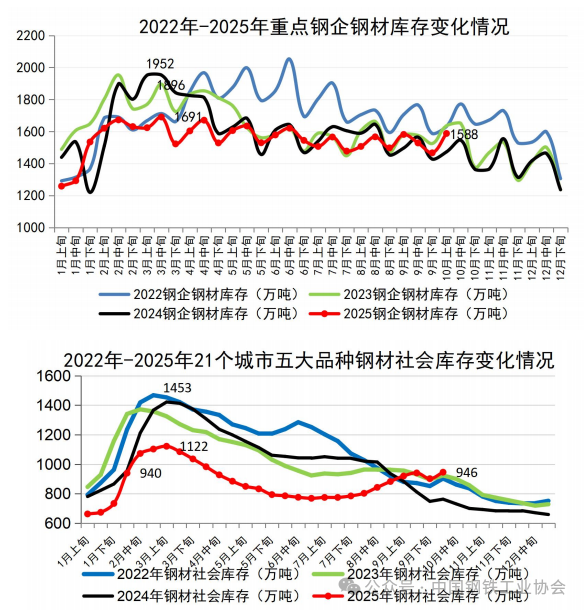 企業(yè)庫存來看,10月上旬重點鋼企鋼材庫存環(huán)比同比明顯增加。2025年10月上旬,重點統(tǒng)計鋼鐵企業(yè)鋼材庫存量1588萬噸,環(huán)比上一旬增加121萬噸,增長8.2%;比年初增加351萬噸,增長28.4%;比上月同旬增加6萬噸,增長0.6%;比去年同旬增加115萬噸,增長7.8%。