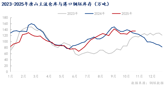 調(diào)研截止至10月23日鋼坯倉儲(chǔ)庫存總量達(dá)150.74萬噸,較上周小幅增加0.29萬噸。從區(qū)域分布來看,唐山地區(qū)庫存占比最高,達(dá)134.13萬噸;天津地區(qū)為0.4萬噸,江蘇地區(qū)則為16.21萬噸。2025年全國鋼坯社會(huì)庫存整體呈現(xiàn)“南低北高”格局,庫存去化節(jié)奏緩慢,市場(chǎng)整體承壓明顯,其中唐山市場(chǎng)的社會(huì)庫存占比較高。以唐山市場(chǎng)為例,2025年鋼坯庫存隨季節(jié)與需求變化呈現(xiàn)明顯波動(dòng):春節(jié)臨近下游調(diào)坯廠逐步進(jìn)入假期,市場(chǎng)需求持續(xù)走弱,鋼坯庫存進(jìn)入累庫周期,春節(jié)期間日均累庫量約1.9萬噸。春節(jié)后下游調(diào)坯廠利潤改善,開工率與產(chǎn)能利用率同步提升,帶動(dòng)鋼坯需求增長(zhǎng),社會(huì)庫存隨之下降。從庫存周期看,2025年上半年鋼坯市場(chǎng)呈現(xiàn)典型的“主動(dòng)去庫”特征:貿(mào)易商基于謹(jǐn)慎預(yù)期維持低庫存,供應(yīng)緊張則強(qiáng)化了這一趨勢(shì)。進(jìn)入下半年,市場(chǎng)轉(zhuǎn)向“被動(dòng)累庫”,其核心驅(qū)動(dòng)力是下游利潤惡化引發(fā)的需求收縮,導(dǎo)致鋼坯在需求不暢中持續(xù)積壓。