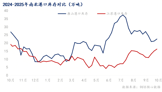 唐山港口鋼坯庫存22.45萬噸,周環(huán)比增加1.3萬噸,較上月同期減少4.6萬噸,較去年同減少5.13萬噸。華東地區(qū)主流港口鋼坯庫存16.21萬噸,周環(huán)比增加1.22萬噸,較上月同期增加5.06萬噸,較去年同減少3.58萬噸。從目前來看,南北港口本周均呈“周環(huán)比增長(zhǎng)”,短期累庫屬于區(qū)域供需節(jié)奏性調(diào)整,并非趨勢(shì)性壓力。中長(zhǎng)期來看北方唐山港口庫存供需結(jié)構(gòu)更優(yōu),庫存壓力持續(xù)緩解;華東港口雖年度壓力減輕,但本月需求釋放弱于北方,短期庫存消化壓力略高于唐山。
