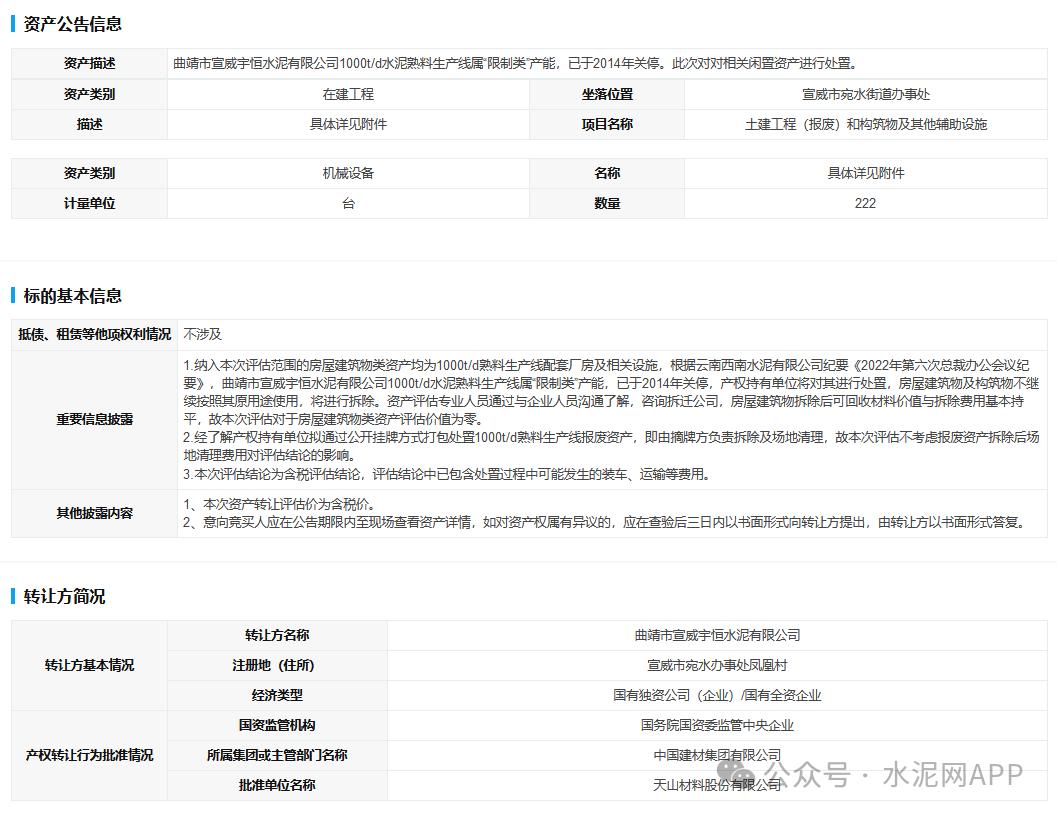 據(jù)介紹,曲靖市宣威宇恒水泥有限公司1000t/d水泥熟料生產(chǎn)線屬“限制類”產(chǎn)能,已于2014年關(guān)停。此次對對相關(guān)閑置資產(chǎn)進行處置。