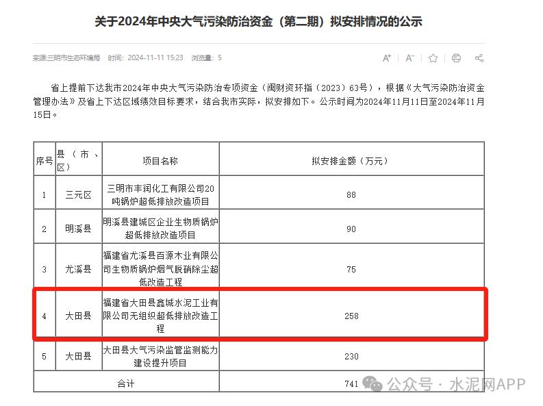 11月11日,福建三明市生態(tài)環(huán)境局發(fā)布“關于2024年中央大氣污染防治資金(第二期)擬安排情況的公示”。根據公示,福建省大田縣鑫城水泥工業(yè)有限公司無組織超低排放改造工程擬獲258萬元資金。