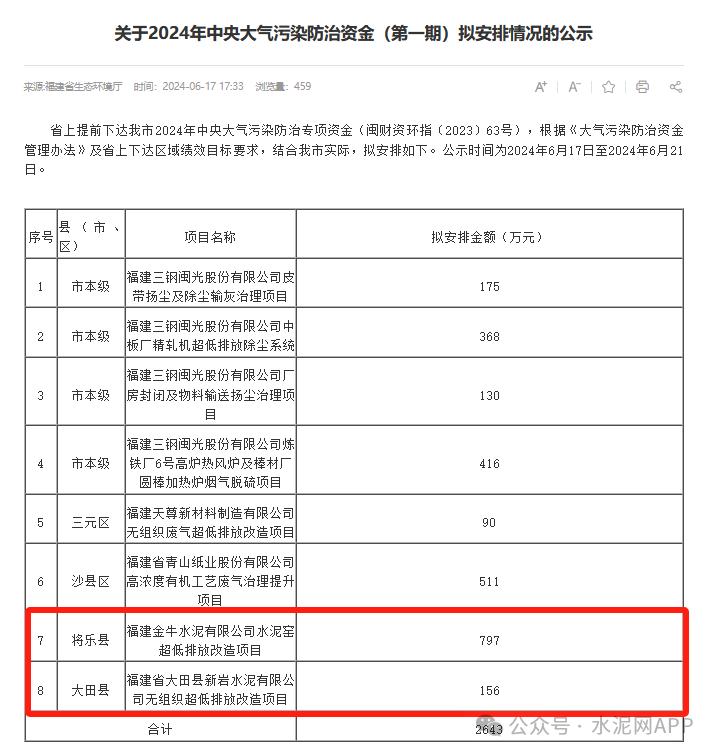 此外,根據2024年中央大氣污染防治資金三明市(第一期)擬安排情況顯示,福建金牛水泥有限公司水泥窯超低排放改造項目擬獲資金797萬元;福建省大田縣新巖水泥有限公司無組織超低排放改造項目擬獲資金156萬元。