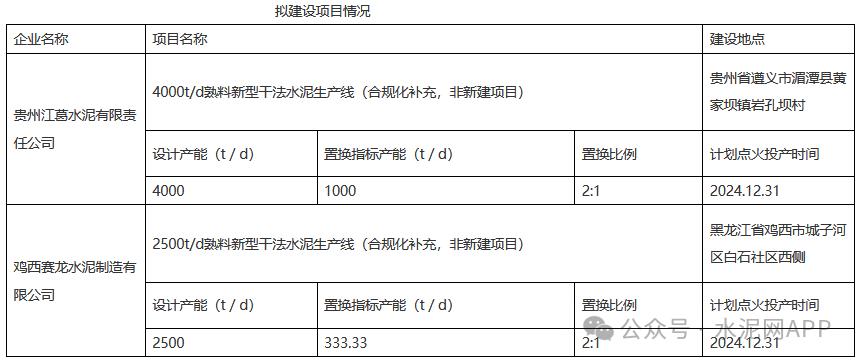 根據(jù)公示,浙江衢州巨泰建材1333.33t/d水泥熟料生產(chǎn)線產(chǎn)能轉(zhuǎn)出,用于補(bǔ)充貴州江葛水泥4000t/d熟料生產(chǎn)線(置換補(bǔ)充1000t/d)、雞西賽龍水泥2500t/d熟料生產(chǎn)線(置換補(bǔ)充333.33t/d)產(chǎn)能。