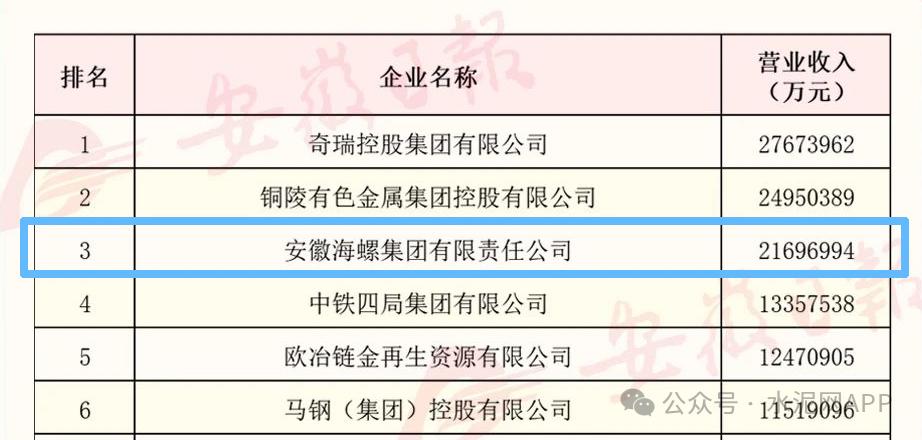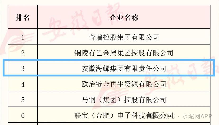 海螺集團名列“安徽制造業(yè)百強企業(yè)榜單”第3位