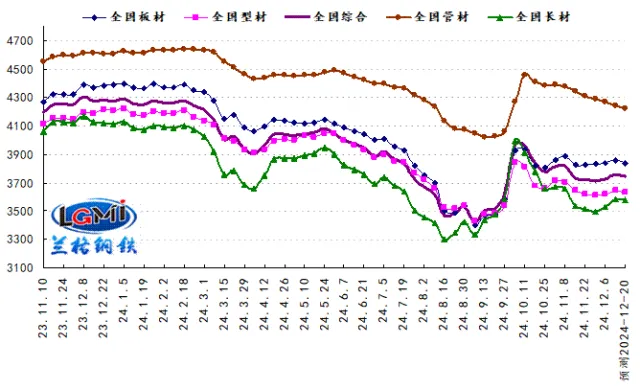 2024年第50周(2024.12.9-12.13)蘭格鋼鐵全國(guó)絕對(duì)價(jià)格指數(shù)為3760元,較上周上升0.9%,較去年同期下降12.3%;其中,蘭格鋼鐵長(zhǎng)材絕對(duì)價(jià)格指數(shù)為3587元,較上周上升1.6%,較去年同期下降13.5%;蘭格鋼鐵型材絕對(duì)價(jià)格指數(shù)為3642元,較上周上升0.7%,較去年同期下降13.4%;蘭格鋼鐵板材絕對(duì)價(jià)格指數(shù)為3858元,較上周上升0.6%,較去年同期下降11.8%;蘭格鋼鐵管材絕對(duì)價(jià)格指數(shù)為4243元,較上周下降0.7%,較去年同期下降8.1%。
