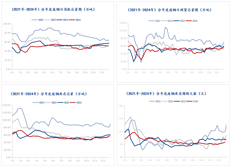 截止12月12日,我的鋼鐵300家長、短流程代表鋼廠廢鋼庫存總量566.03萬噸,較上周增加25.05萬噸,增幅4.63%;庫存周轉(zhuǎn)天數(shù)9.5天,較上周增0.2天;日消耗總量51.76萬噸,較上周增加0.55%;日到貨總量54.56萬噸,較上周增加0.61%。上周的鋼廠廢鋼庫存大幅上升,周度增幅明顯擴(kuò)大,月環(huán)比增加39.23萬噸,增幅7.45%,年同比下降36.17萬噸,降幅6.01%。當(dāng)前庫存水平仍處于低位水平,當(dāng)前庫存可使用天數(shù)較去年同期下降0.6天,較2024年春節(jié)前峰值下降2.3天,仍有較大增長空間。從春節(jié)前庫存水平來看,2024年春節(jié)前庫存峰值是719.52萬噸,2023年同期峰值是727.46萬噸,從今年供應(yīng)減少以及節(jié)前消耗情況來考慮,預(yù)計(jì)2025年春節(jié)前庫存水平將在640-680萬噸左右。目前鋼廠仍有1個月左右時間進(jìn)行冬儲備庫,電爐廠處于利潤修復(fù)考慮,預(yù)計(jì)將于元旦前后陸續(xù)停產(chǎn),后期資源流動速度將有所加快,鋼廠廢鋼庫存進(jìn)入快速累積階段,對行情有較大支撐作用。總結(jié):上周全國廢鋼市場先漲后跌,整體小幅偏強(qiáng)運(yùn)行,鋼廠廢鋼庫存增幅明顯,廢鋼消耗基本持穩(wěn)。電爐廠開工率及產(chǎn)能利用率降幅有限,本月需求仍有一定支撐;供應(yīng)方面,場地冬儲尚未開始,社會庫存增幅有限,資源供應(yīng)流動加速。預(yù)計(jì)本周廢鋼市場將呈現(xiàn)窄幅震蕩走勢,價(jià)格相對堅(jiān)挺運(yùn)行。