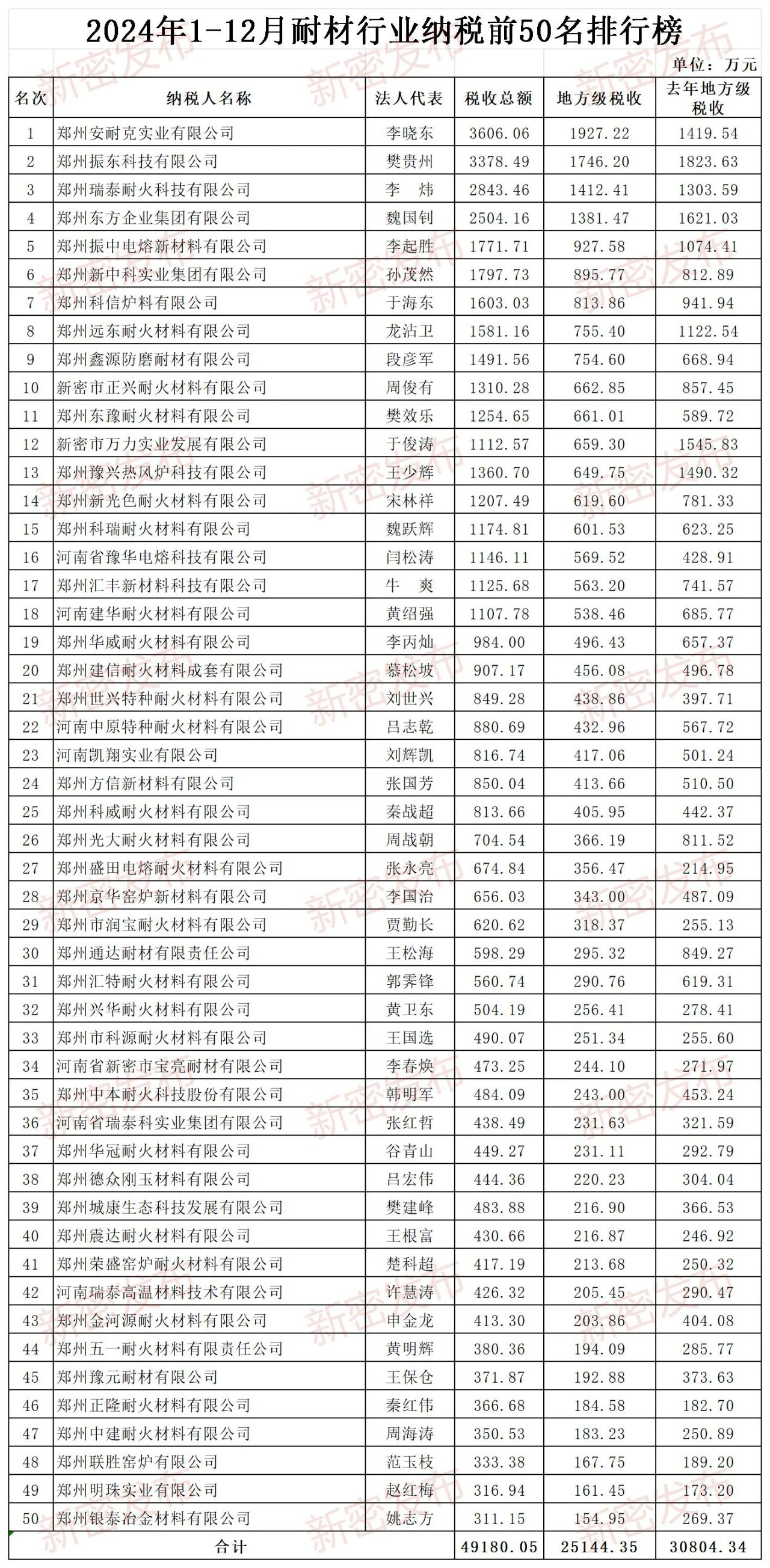 新密市2024年1-12月耐材行業(yè)納稅前50名排行榜