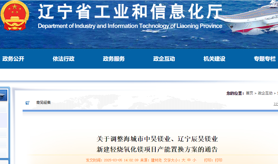 按照《遼寧省人民政府辦公廳關(guān)于推進菱鎂行業(yè)高質(zhì)量發(fā)展的實施意見》(遼政辦發(fā)〔2023〕15號)、《遼寧省菱鎂礦浮選及鎂砂行業(yè)產(chǎn)能置換辦法》(遼工信建材〔2024〕18號)要求,根據(jù)企業(yè)申請、鞍山市初審和申請,因建設(shè)內(nèi)容、建設(shè)地點等項目內(nèi)容變更,對海城市中昊鎂業(yè)有限公司、遼寧辰昊鎂業(yè)有限公司新建輕燒氧化鎂項目產(chǎn)能置換方案進行調(diào)整,現(xiàn)對調(diào)整后的產(chǎn)能置換方案重新予以通告。